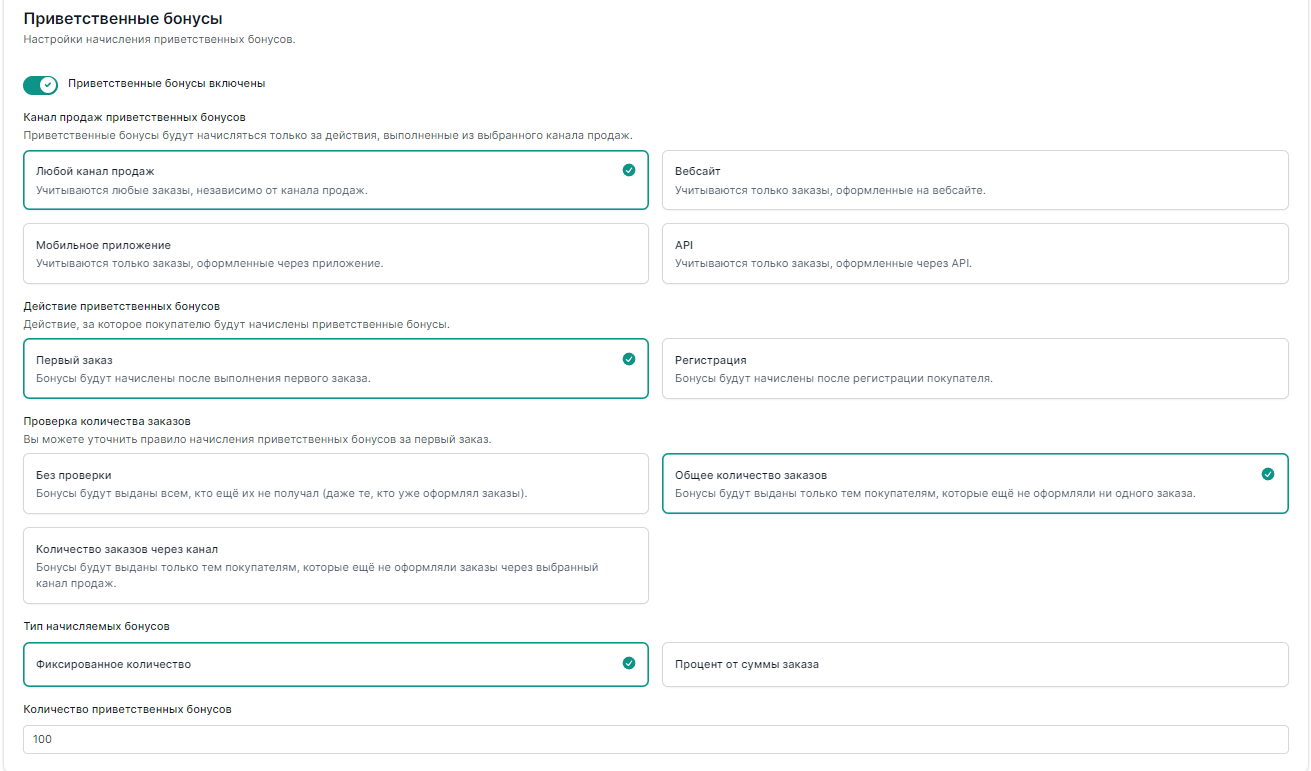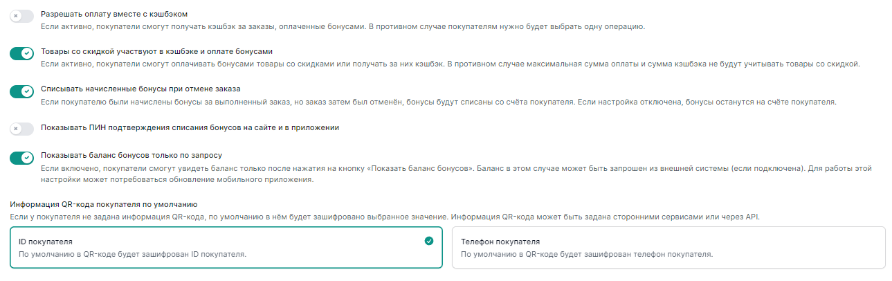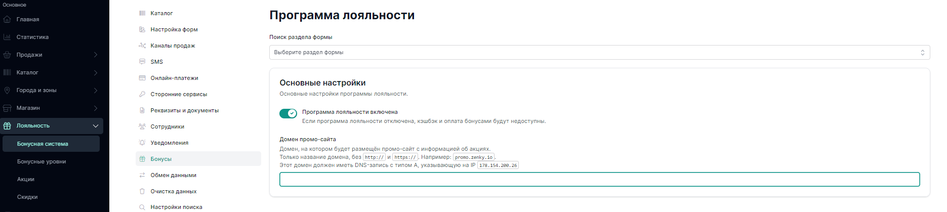 Чтобы настроить бонусную систему нужно зайти на страницу настройки `«Лояльность — Бонусная система».`  и включить бонусную систему.