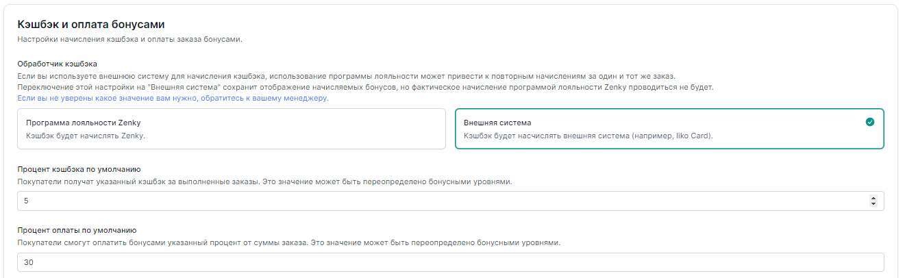 После включения нужно указать процент кэшэка или  бонусного начисления от суммы покупки. А также выбрать, какая система будет производить начисление бонусов.