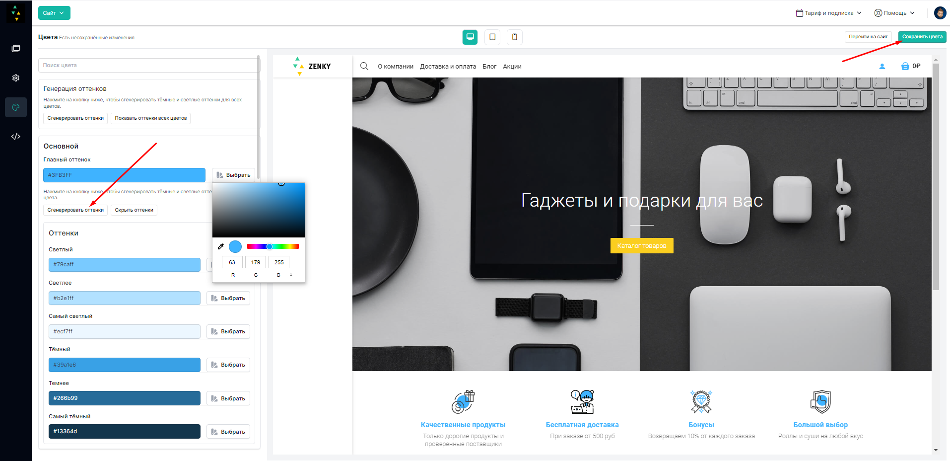 После выбора цвета - не забываем сгенерировать для него оттенки, и сохранить цвета зеленой кнопкой в правом верхнем углу. \